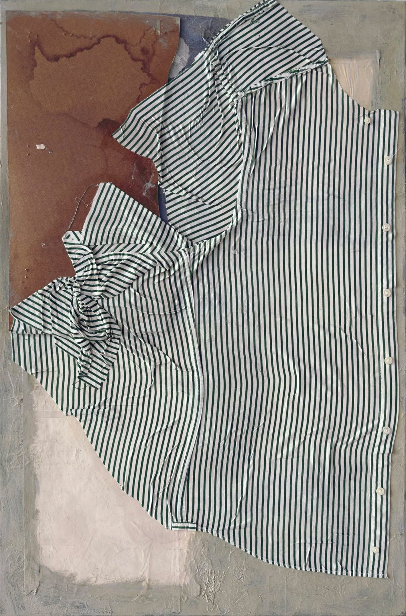 Untitled (Sharing a Room), shirt, paper, oil, canvas, 2025